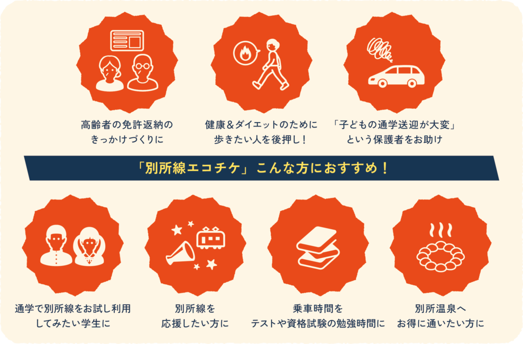 エコチケ 上田電鉄別所線の回数券5,500円分を1,000円で販売する 「別所線エコチケ」を期間限定で販売します。今年3月からの平日増便で乗る人が増えている別所線。この勢いを応援するチャンスは今! 超お得なチケットを限定販売します。 別所線に乗る人が増えたら、どんな未来が見える? みなさんもぜひご参加ください! 実施概要 販売期間 12月1日(月)~21日(日) 販売価格 1,000円(5,500円分) 販売数 先着1,000名 購入条件 事前・事後アンケートに回答できる中学生以上の方(お一人1枚まで) 利用可能期間 使い切るまで制限なし ご利用の流れ 購入方法 チケットQRと紙チケットの2種類があります。 アプリの場合(ticketQR) アンケートフォームに回答 アンケート回答後にメールでパスワードが送られてくる チケットQRアプリを開き、「サービス」→「期間限定!おとくなチケット」→「エコチケ」と進み、パスワードを入力してエコチケを購入 スマートフォンからもこちらのQRコードでアンケートに回答できます 紙チケットの場合(別所線上田駅窓口) 窓口にある紙のアンケートに回答、もしくはこちらをクリックしてアンケートフォームに回答 窓口にアンケートの提出、またはアンケートフォーム回答後の自動返信メールを提示 窓口でエコチケを購入 ※アンケート回答後はすみやかにエコチケをご購入ください。販売期間を過ぎたり、販売枚数が終了すると購入できなくなります。 ※アプリの場合、事前に TicketQRアプリ のダウンロードが必要です。 iPhone(App Store) App Storeでダウンロード Android(Google Play) Google Playでダウンロード こんな方におすすめ! Q&A Q. TicketQRでエコチケを購入しましたが、どこに表示されていますか? A.TIcketQR内の下段左にある「かざす」→「別所線プリペイド」に5500円分が追加されているはずですのでご確認ください。 Q. アンケートに答えないと買えない? A. はい。試験導入の効果検証のため、アンケート提出にご協力をお願いします。 Q. スマホを持っていません A. 別所線上田駅窓口で紙アンケートにご記入いただければ、紙チケットを購入できます。 Q. 家族の分も買いたい A. 別所線上田駅窓口の場合、代表者がまとめて購入可能ですが、購入時に全員分のアンケートが必要です。TicketQRアプリをお持ちならご自宅でご購入いただけます。アンケートからお入りください。 Q. チケットの使用期限は? A. 使用期限は設けていません。残額がなくなるまでお使いいただけます。 Q. チケットを紛失した場合は再発行できる? A. 再発行はできません。紛失にはご注意ください。 Q. 小学生の子どもがほしがっている A. 申し訳ございません。今回は大人料金の中学生以上を対象として います。 Q. 答えに迷うアンケートがある。 A. 厳密な回答でなくてかまいません、大体でお答えください。 Q. 沿線住民じゃないけど買ってもいい? A. もちろん構いません!ぜひこの機会に別所線をお得にご利用ください Q. マイレールチケットを買ってしまった。払い戻してほしい。 A. 申し訳ありませんが払い戻しはできません。エコチケも使用期限はなく、今回限りの販売ですので、お得にご利用ください。 Q. パスワードつきメールが送られてこない A. まずはご登録いただいたメールアドレスが間違っていないか、迷惑メールで受信されていないかご確認ください。それでもメールが確認できない場合はinfo@eneshift.orgまでお問い合わせください Q. パスワードを入れたが購入できなかった A. パスワードを再送いたしますので、info@eneshift.orgまでお問い合わせいただき、後日予備のパスワードを送付させていただきます。 このプロジェクトは、国土交通省モビリティ人材育成事業のフィールドスタディとして、上田電鉄株式会社の協力を得て、NPO法人上田市民エネルギーが実施する事業です。格安チケットの試験導入によって別所線利用者を増やす研究を目的としています。 お問い合わせ NPO法人 上田市民エネルギー 📞 070-8339-1540 (平日:10:00~16:00) ✉️ info@eneshift.org